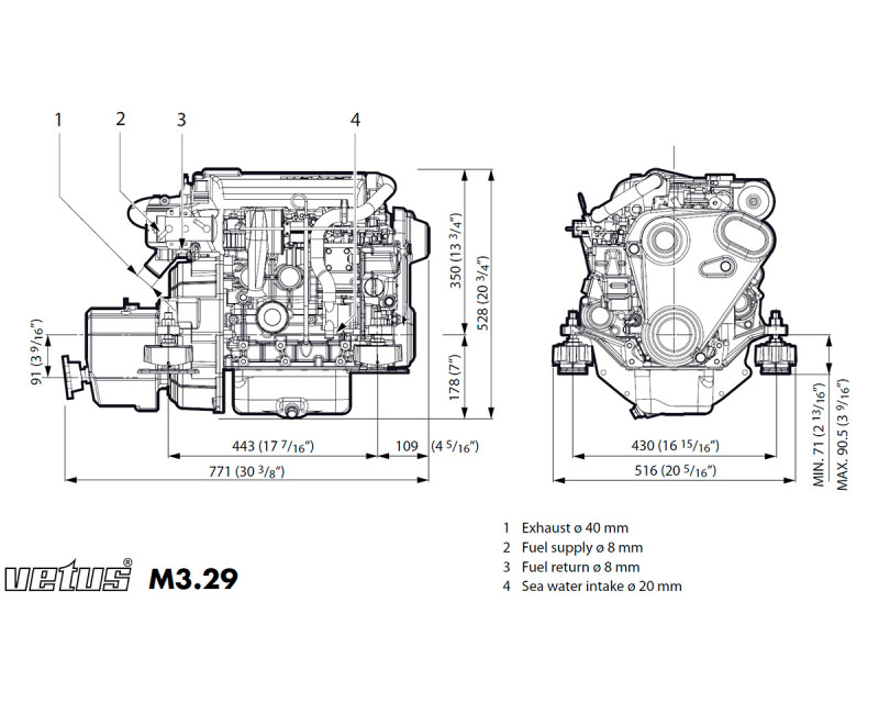 Vetus M3.29 outboard engine 27 hp (20 kW) @ 3600 rpm. TMC60A with marine gearbox. TMC60A gearbox with tilted output flange.