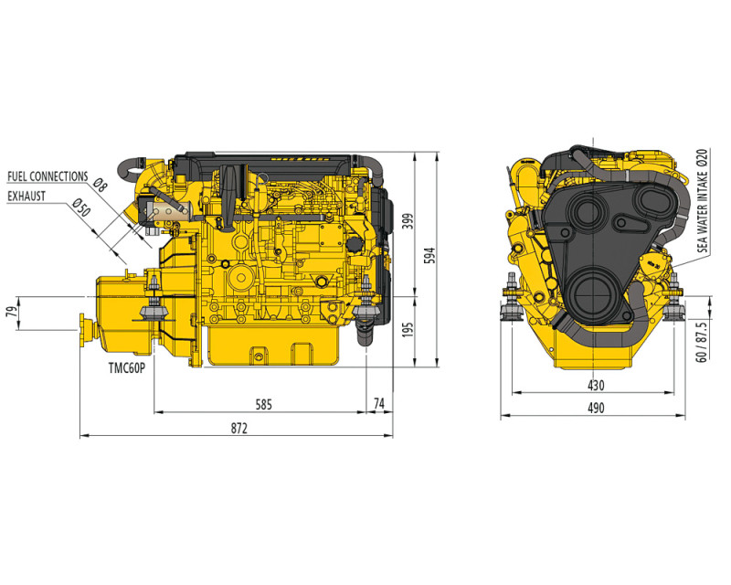 Vetus M4.35 venemoottori 33 hp (24,3 kW) @ 3000 kierr/ min. TMC60 merivaihteella, välitys 2.45:1.